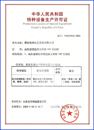 松岭化工专注化工设备行业15年,集科研、开发、设计、 生产于一体的高新技术企业,还具备设计、制造D1、D2类压力容器资质。质量保障